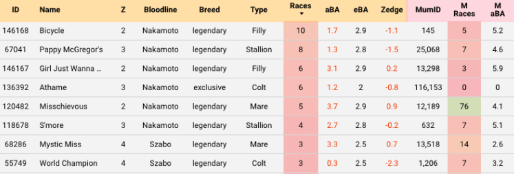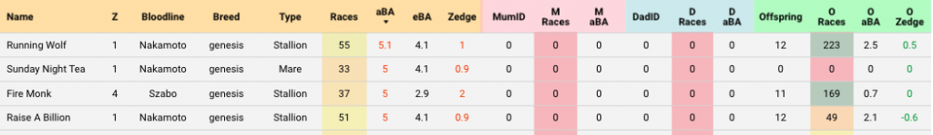 Step 5: If you find a horse with high aBA but low offspring Zedge, both with decent race counts, put the horse in the momID or DadID filter which will show you all of their foals and the other parents BA. Remember to clear all filters (horse traits and race count) so you’re looking at all of the foals. Sort those by race count to see who’s influencing the offspring score the most. Raise a Billion, in the example above, is a good example. Very good aBA and a strongly negative O Zedge. Let’s dig deeper.