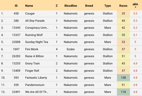 Step 3: Sort by aBA. This gives you a list of the highest base ability horses based on your filters above. Even with your race filter, keep an eye on race counts.